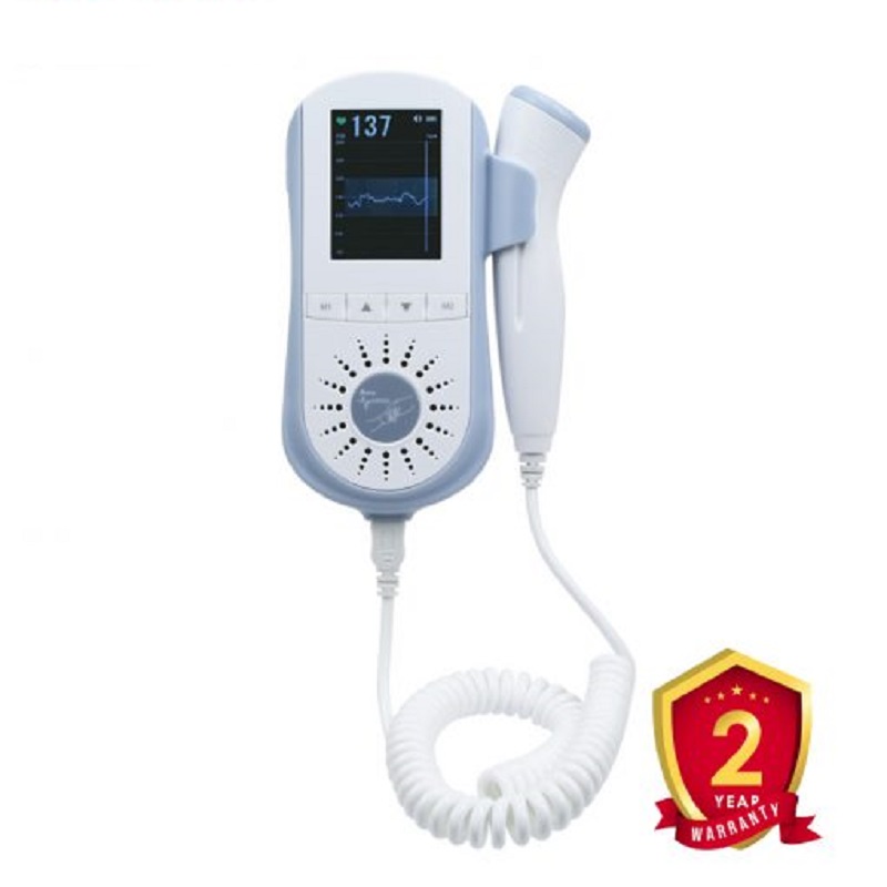 - Màn hình LCD lớn hiển thị rõ ràng các thông số như nhịp tim/phút của bé, dung lượng pin, chế độ đo, tần số siêu âm và âm lượng máy.